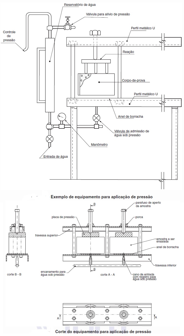 O equipamento empregado para a aplicação de pressão (ver figuras abaixo) deve permitir a entrada de água por um orifício centralizado com o local de posicionamento do corpo de prova e deve ser dotado de manômetro, válvula reguladora de pressão, reservatório para água e tubulações com registros de acordo com as condições definidas a seguir: manômetro com fundo de escala de 1,5 MPa e resolução de 0,01 MPa; válvula reguladora de pressão capaz de reduzir a pressão ao nível desejado no ensaio; e reservatório para água, estanque e dimensionado para suportar com segurança a pressão de ensaio. O reservatório deve ter capacidade de armazenamento de água sufi ciente para realização do ensaio.