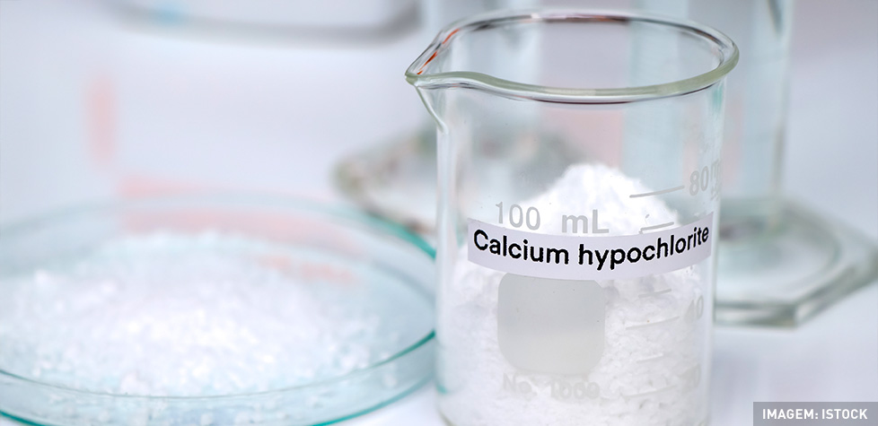 O hipoclorito de cálcio é um sólido branco que contém 65% de cloro disponível e se dissolve facilmente em água. É muito estável e pode ser armazenado por um longo período, porém é um material corrosivo com forte odor. As reações entre o hipoclorito de cálcio e material orgânico podem gerar calor suficiente para causar incêndio ou explosão.